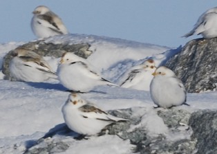 My hat’s off to great bird photographers. Birds are difficult subjects. Watching us intently with expressive little faces, these fat McKay’s Buntings tolerated us getting within about 25 feet before flying away. Their feathers were fluffed up for warmth, making them look roly poly. Today was a gorgeous day to try and capture them: icy clear skies and 6 degrees above zero.