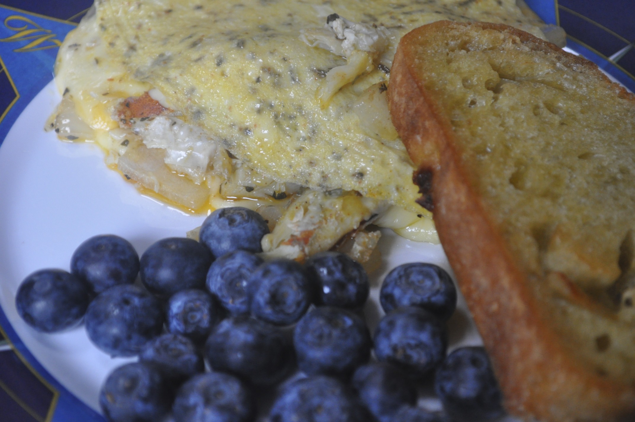 Serve the omelet with your favorite salsa, slices of avocado, or seasonal berries and a slice of bread pan-fried in olive oil. This dish isn’t just for breakfast and pairs equally well with a dark roast coffee or a good Chardonnay or Viognier. White meat fish such has halibut, rockfish or walleye can be substituted for the crab. Serves two.