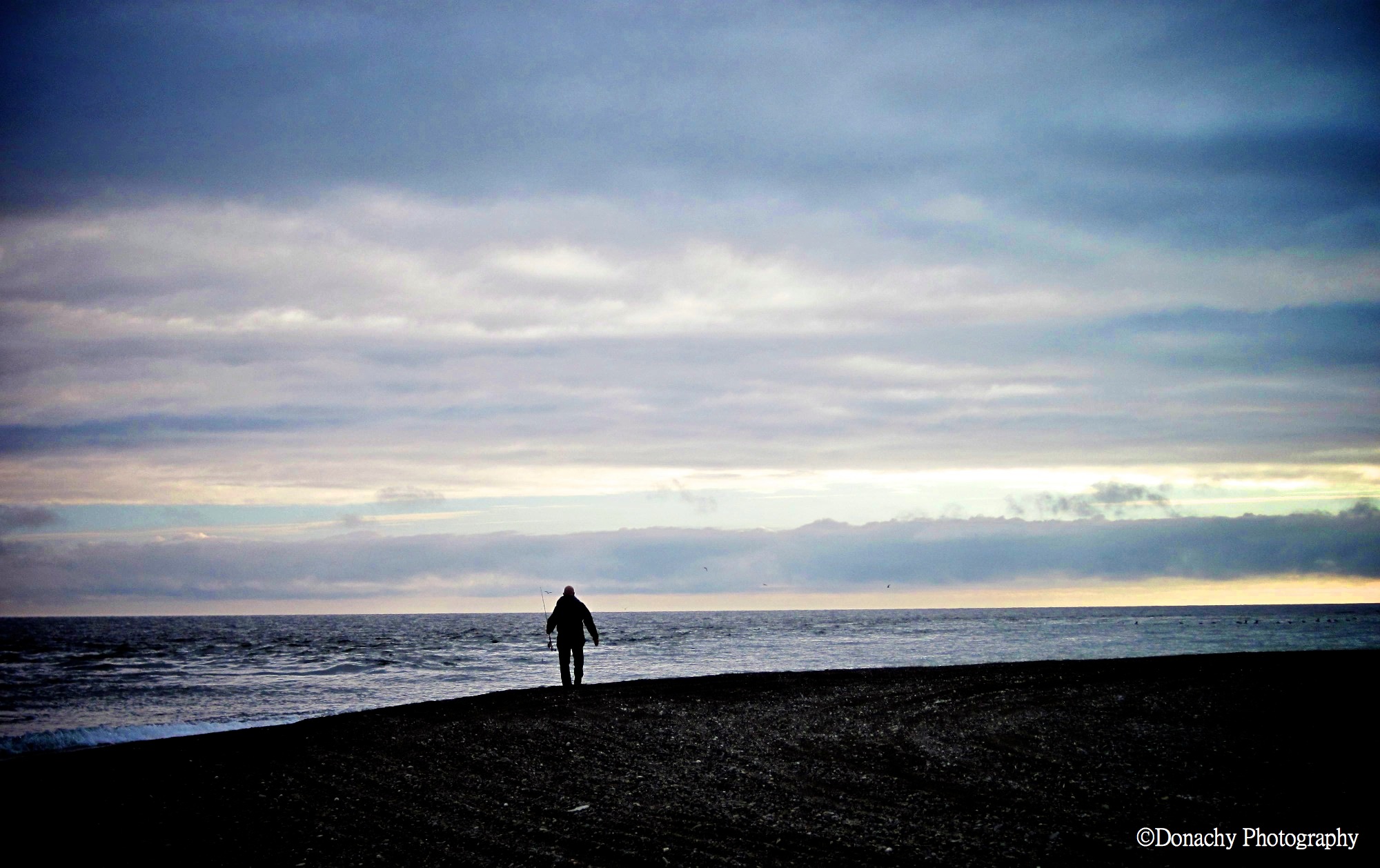 A solitary surf fisherman in late August hoping to intercept the last of the pink salmon or a roving school of Dolly Varden on the point at Point Hope, Alaska.
