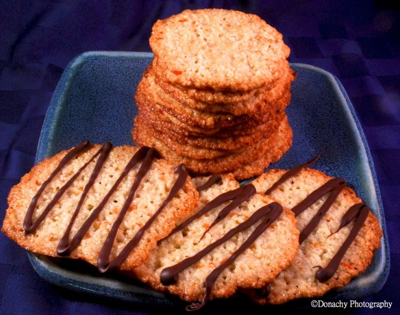 When I was young my family sometimes went to a deli in San Francisco where, out of an assortment of scrumptious confections, I was allowed to pick out a cookie after our meal. Often, I chose a chocolate dipped florentine, a delicious almond cookie flavored with the essence of orange zest, one of my favorite combinations.