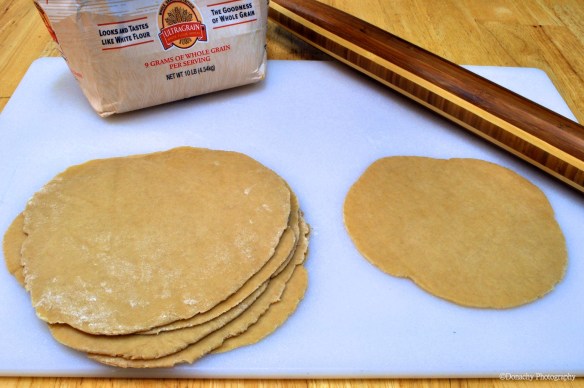 7. Take one dough ball and flatten by hand into a circle. Place flattened dough on lightly floured surface. Cover with parchment paper. Roll out with rolling pin, just as you would a pie crust. The result should be a flat, circular tortilla about 8″ in diameter and 1/8″ or less thick. Continue with remaining dough balls. Stack finished tortillas, using parchment paper to keep them separate.