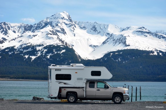 Our home on wheels the past three summers – a Lance camper perched on a 3/4 ton Chevy Silverado, here parked for lunch with a gorgeous view of Resurrection Bay near Seward, Alaska. Note the hitch for towing our C-Dory 22 Angler. This photo was taken on May 21, 2012.