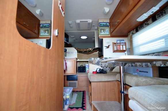 A carved wooden hummingbird given to us by our daughter, Maia, on a trip that passed through a First Nations village in British Columbia greets us each time we open the door. Framed artwork and other personal touches make our camper a home.