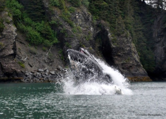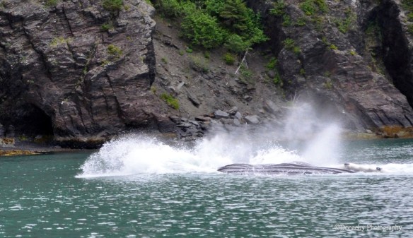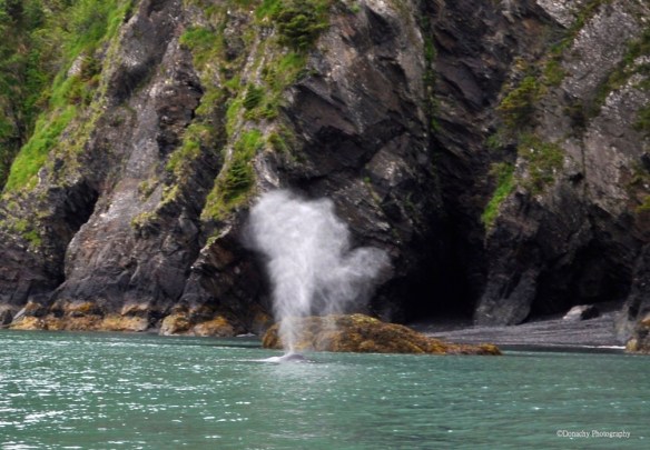 Quintessential Alaska – a whale blows close to moss and fern covered rocks in Resurrection Bay. The water is hundreds of feet deep near shore here – this slope face rises almost vertically to snow-coverd peaks.