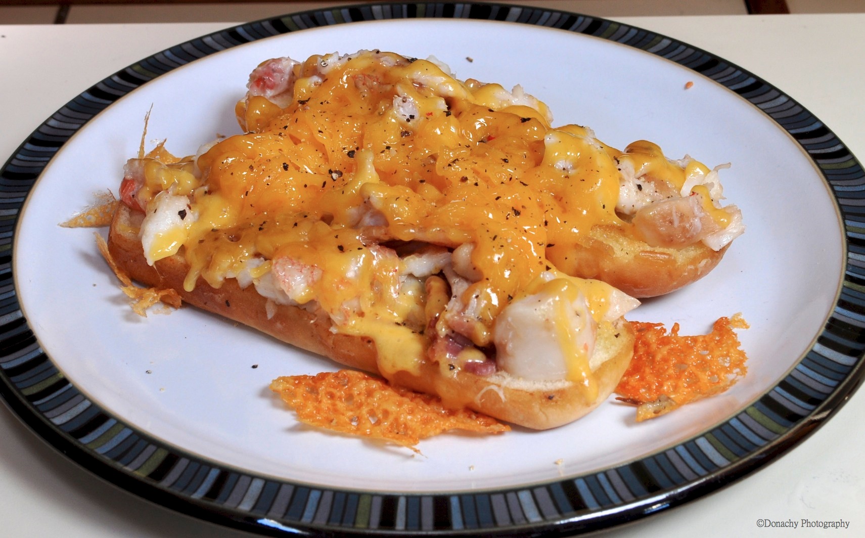 Flip the bread to toast the other side, place the hot, cooked seafood on the toasted side of the bread, cover with shredded cheddar cheese, add a few grinds of pepper and some sea salt, then cover the pan with a lid and continue cooking over low heat till the cheddar is melted.