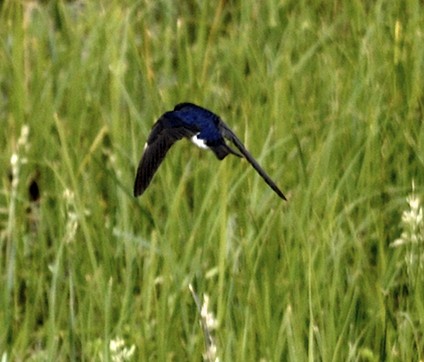 Violet-green swallows (Tachycineta thalassina) are common throughout the western U.S., Canada and Alaska. In flight, look for the distinctive white on the sides of the rump. When they perch, look for white cheeks with white extending above the eye to distinguish them from tree swallows (Tachycineta bicolor).