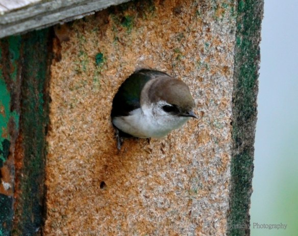 Depending on the light, violet-greens’ backs can appear to range in color from teal to metallic green to purple. This is the male, above.