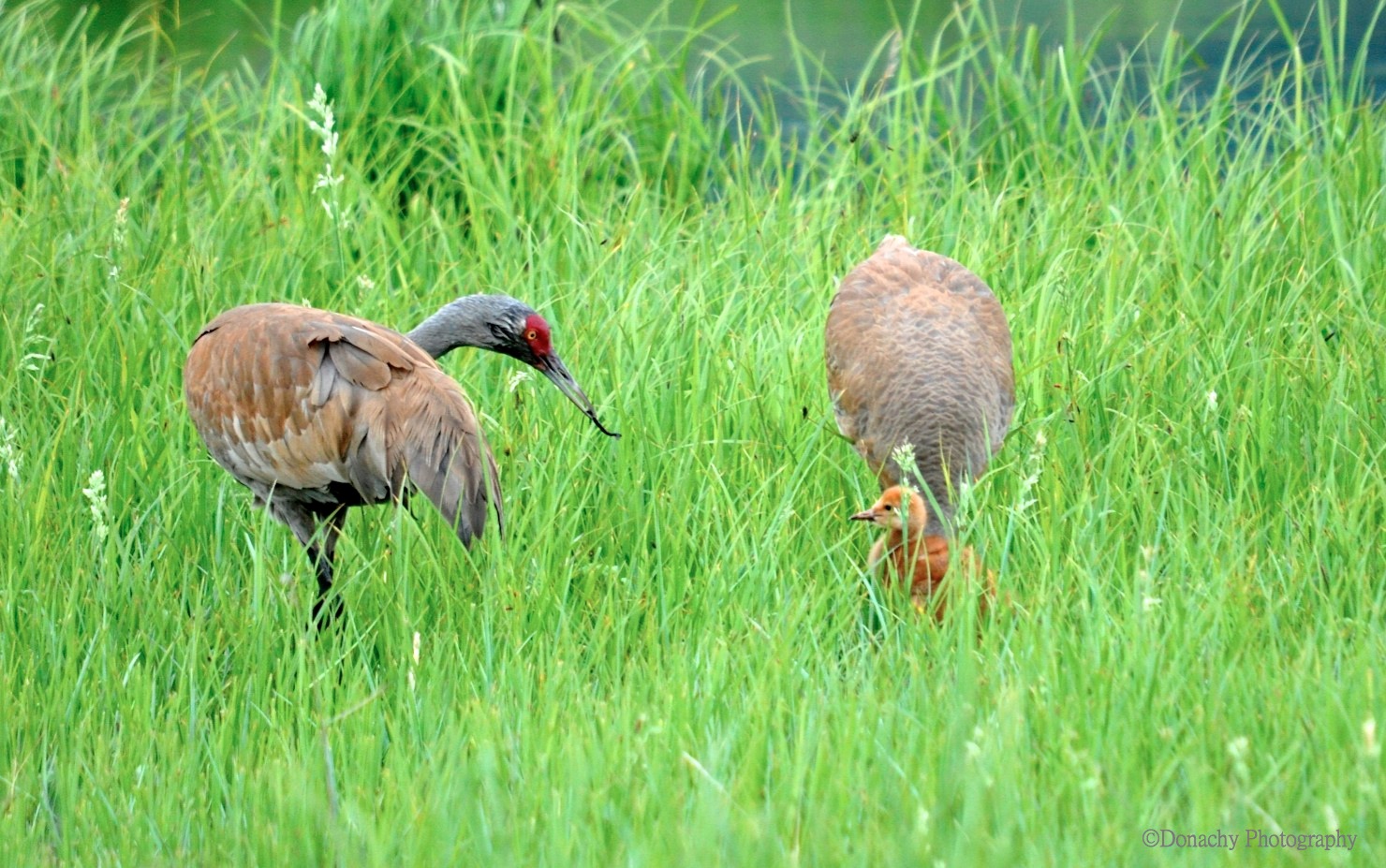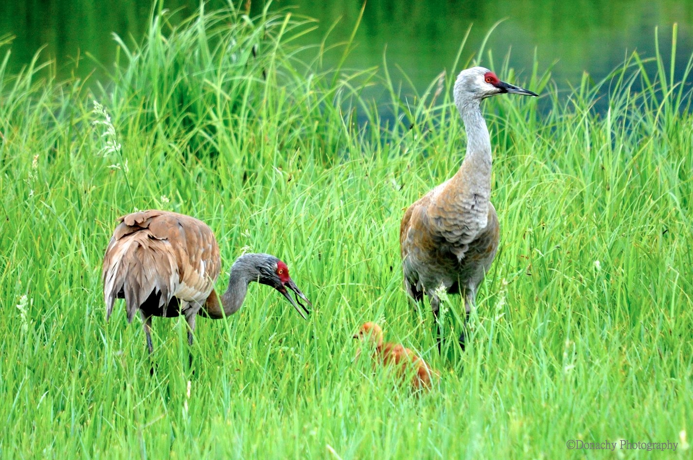 We couldn’t quite make out what the adult bird is feeding the chick. Cranes are catholic in diet. Berries and seeds make up a large portion of their diet, but insects and other small animals figure in as well.