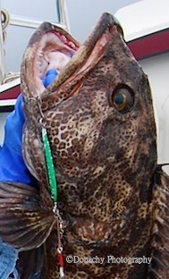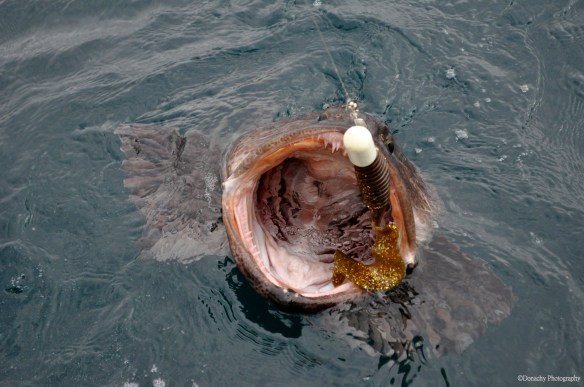 A 10″ twister tail grub on a 1 pound jighead is dwarfed in the maw of a 40-pounder. Root beer is a favorite color among lingcod fishermen. Here the color is paired with a glow-in-the-dark jig.