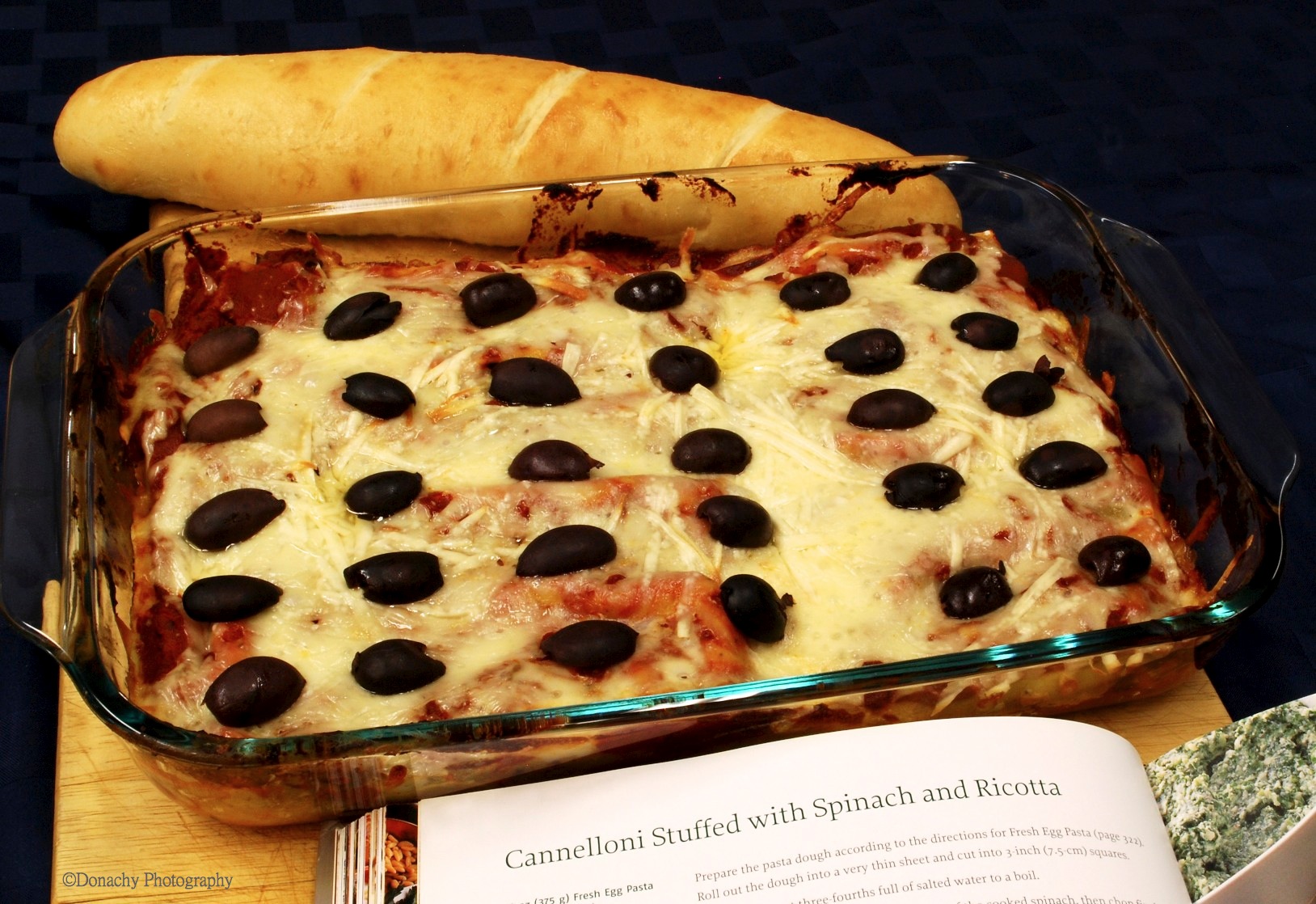 - (Optional). If desired, sprinkle grated mozzarella and parmesan atop the sauce-covered cannelloni. Top with Kalamata olives.