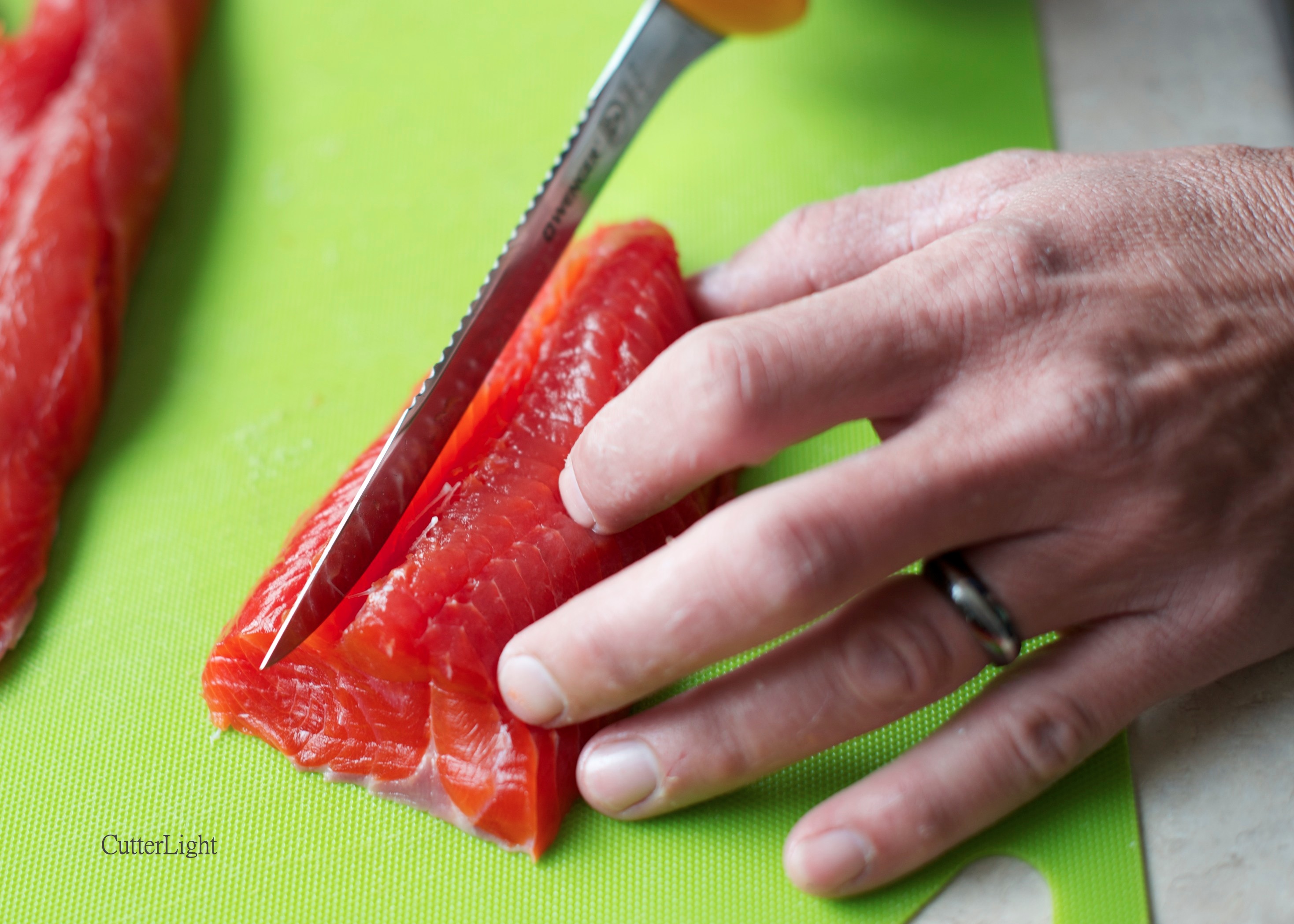 Above: Removing the pin bones from a Sockeye fillet. Of the eight species of Pacific salmon, Sockeye (red salmon) have the firmest flesh and are second only to Chinook in terms of fat content. These attributes make them a perfect choice for sashimi or seared tataki.