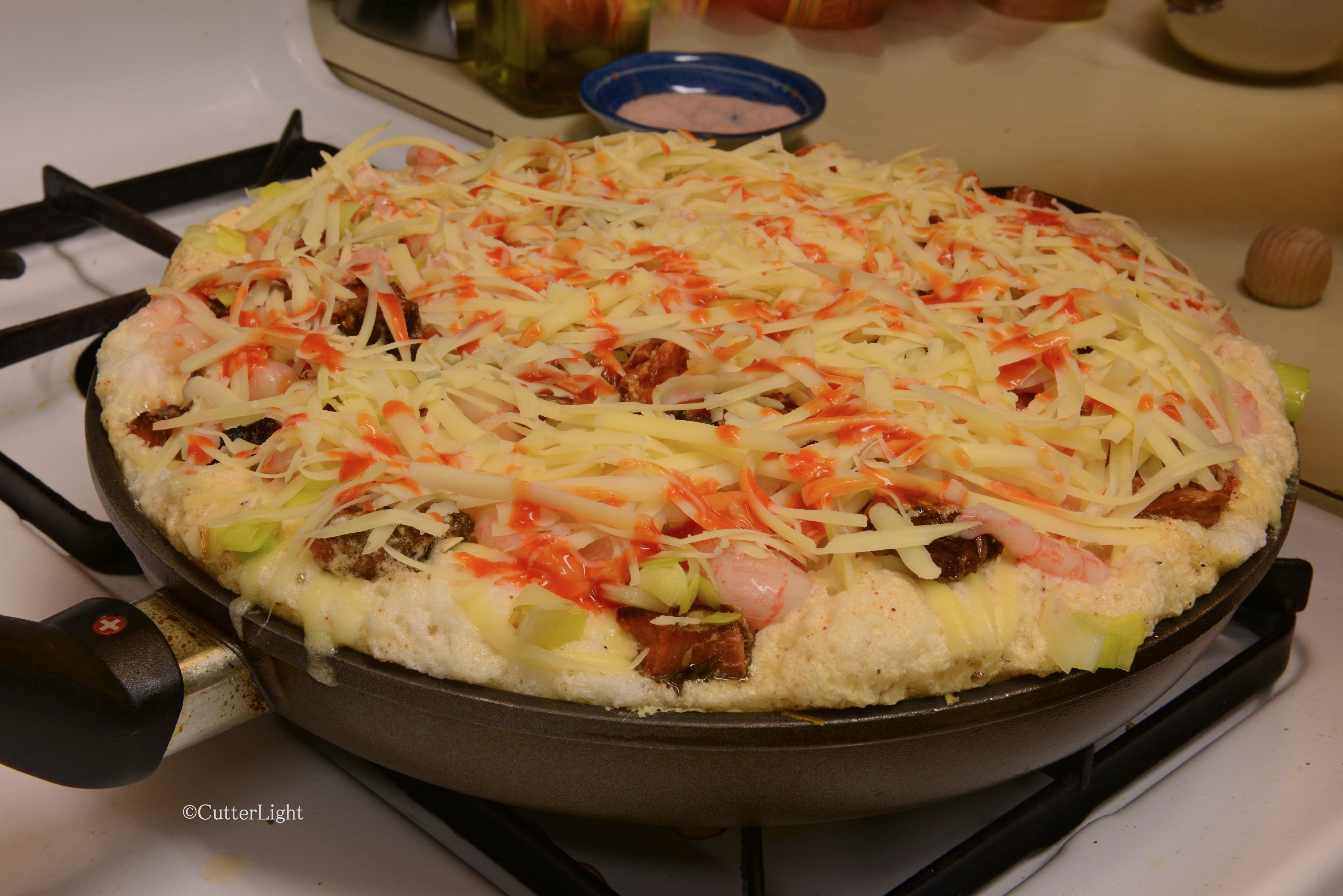 Splashed with Cholula sauce and ready for the oven. It helps to start the frittata by cooking it for a few minutes on the stove before placing it in the oven. A non-stick pan such as the excellent ones made by Swiss Diamond are a good choice, as they are oven safe.
