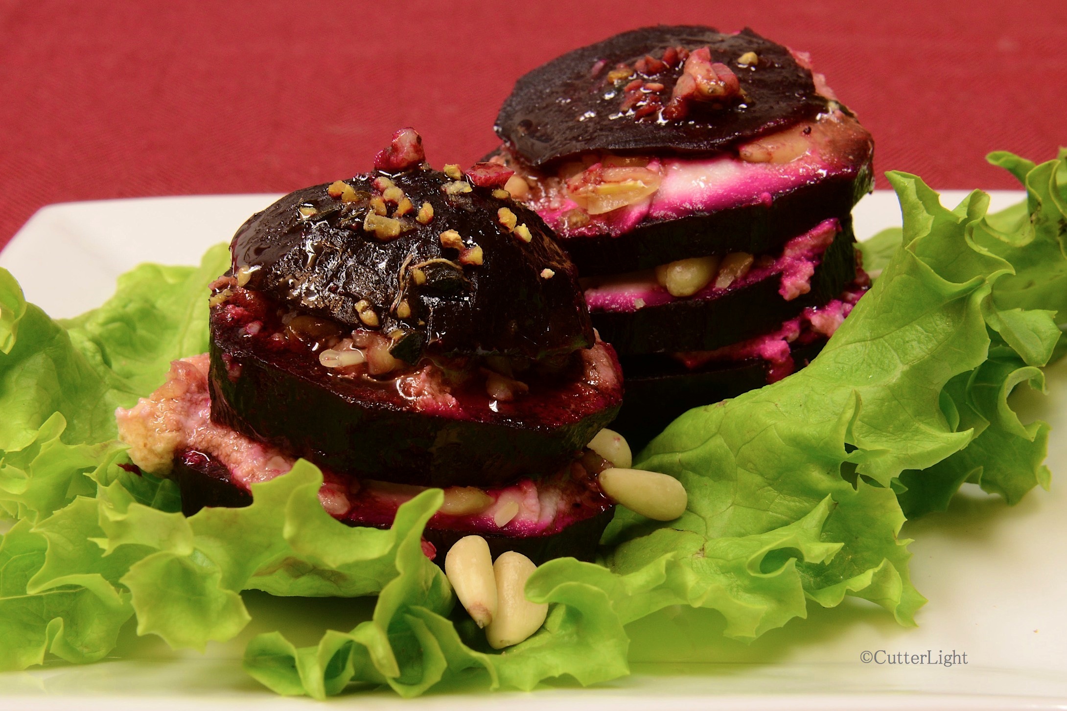 This stacked beet salad, made from roasted beets and homemade goat cheese, goes nicely with beef.