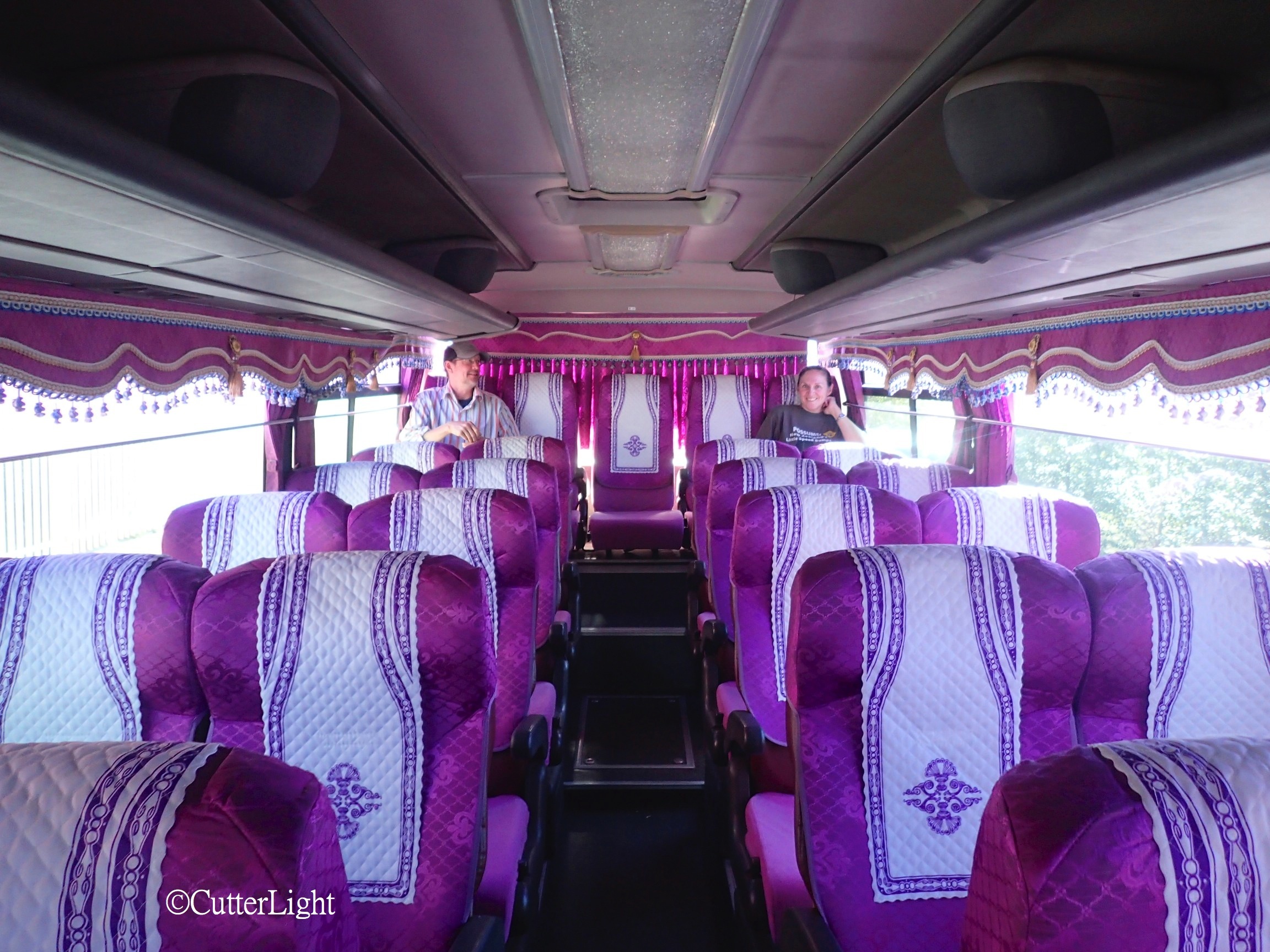 This elaborately decorated bus took us to the feast site. Opulent to our eyes, we were told that this is a “normal” bus. (Our friend Dawn Doig is seated on the right.)