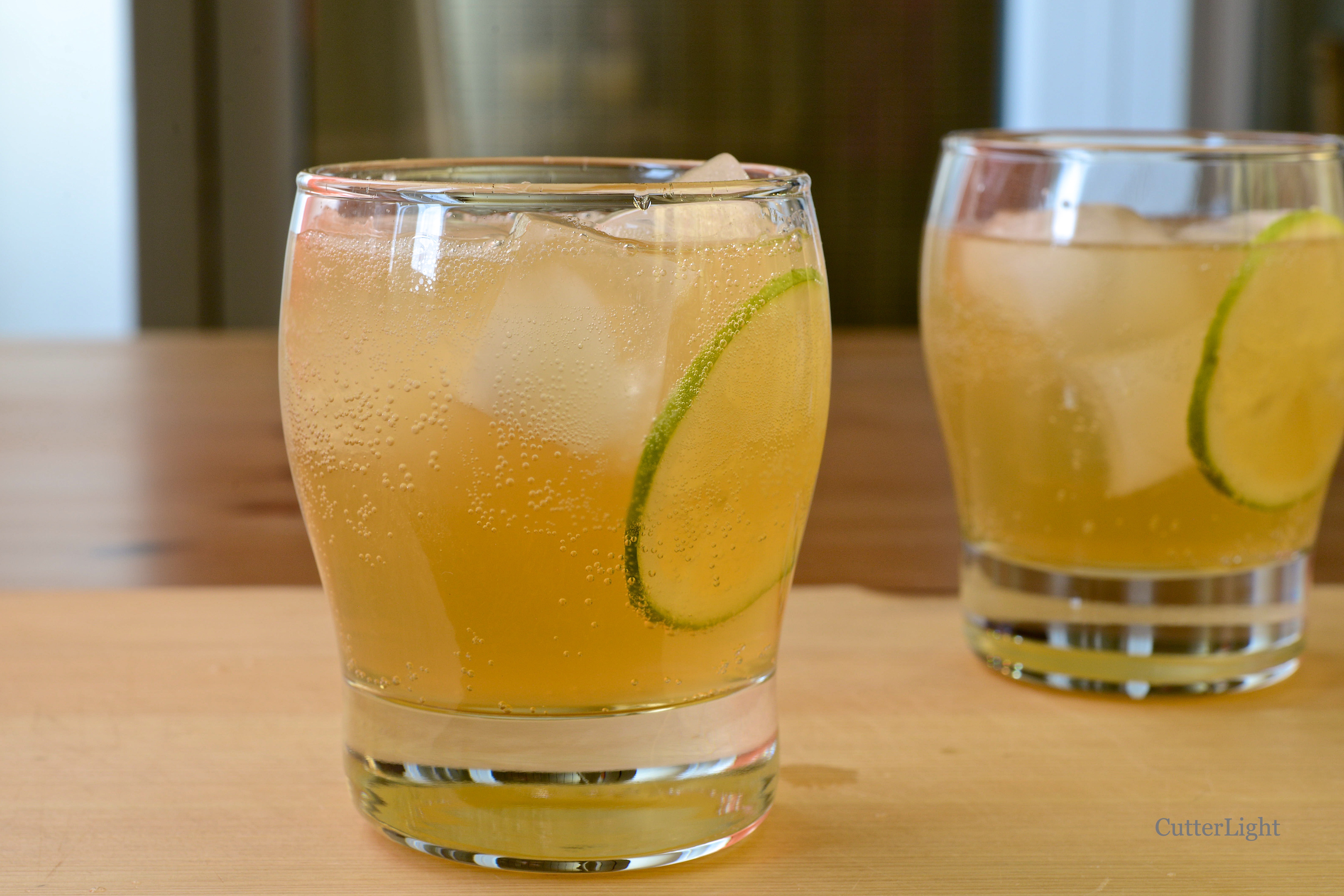 - Pour bourbon, gin, lime juice, and ginger ale over ice.
