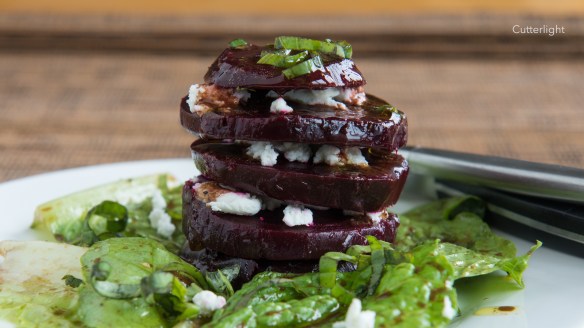 9. Place greens on plates. Top greens with one slice of roasted beet. Sprinkle beet slice with goat cheese. Continue with remaining beet slices and cheese. Repeat this process on another plate with the second beet.