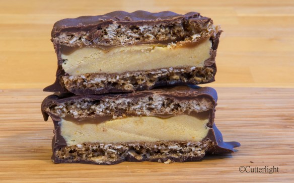 Would the caramel be too hard? Would the frozen cookies remain chewy? Would the coating have that wonderful crunch? The answer, as you’ve probably guessed, is a resounding Yes! They are a bit time consuming to make because of having to wait in between steps for freezing. It’s totally worth it. After all the time put in to making these at home, we have eight delicious ice cream sandwiches to enjoy and to share with friends.