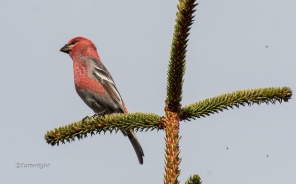 His colors will never be brighter than they are right now, nor his call more cheerful. Pine Grosbeaks tend to be irregular in their presence, but for the past two years in Chignik Lake they’ve been regular residents. For a look at a nearby female, which is very differently colored, see below. (Note the midges flying around to the right in the above photo. With big insect hatches coming off the lake and river, our swallows should be here any day!)