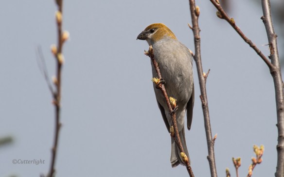 Female Pine Grosbeaks feature a rich olive-gold on their head, upper back, rump and often on their upper breast. This time of year, the leaf buds of deciduous trees figure heavily in Pine Grosbeaks’ diets. During wintertime they can be attracted to feeders featuring black oil sunflower seeds, suet or (I’m guessing) peanuts. They also love small fruit and during warmer months will include insects in their diet.
