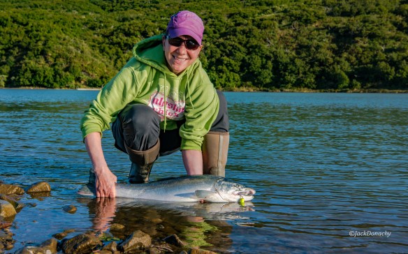 Ocean-bright and full of fight, Barbra’s 12-pound Coho today is the first and only salmon we’ve put on the bank this year… so far.