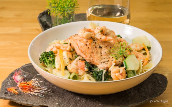 Dill, dill, dill. What to do with dill? It’s not a seasoning I often use, but thanks to our friends up the Alaska Peninsula at The Farm Lodge in Port Alsworth, we found ourselves with an abundance of this pleasantly aromatic herb blooming in a glass jar on a windowsill. How about using it in a cream sauce to bring together fillets of freshly caught Chignik River Silver Salmon, farfalle pasta, and some of the last zucchini and summer squash we’re likely to see for awhile?