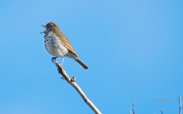 It’s spring and everyone is singing. One of the morning’s objectives was to photograph the Hermit Thrushes that came in with Wilson’s Warblers about a week ago. I’m still looking for a great shot, one with catchlight in the subject’s eye and the bird near enough to crop in portrait close, but this is a start.
