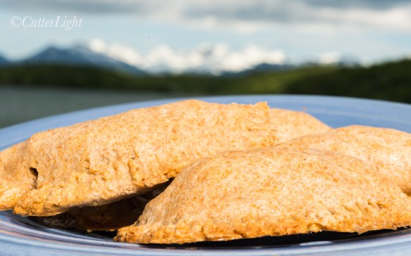 Moose meat hand pies on a borrowed plate and a bit wonky looking. Maybe the beautiful Chignik Woodblock Mountains in the background will distract you. They are gorgeous!