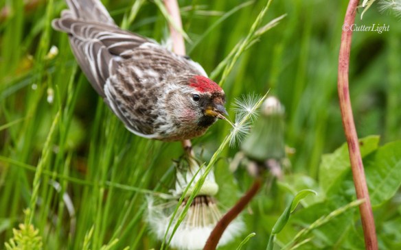 Redpolls (above), Pine Siskins and Pine Grosbeaks have been visiting daily to feast on Dandelion seeds around the playground outside our door. We watch them out the window as we cook and wash dishes and have been heartened by their cheerful songs and chatter  throughout the day as we come and go. I cautiously eased open our front door and took this photograph from our kellydoor, the local nomenclature for mudroom. If you haven’t checked out our video of these Dandelion seed eating finches, you can find it here: Finches of the Dandelion Jungle