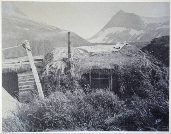 Thick grasses overtake this old-time wood and sod home at Chignik Bay, an area that has been inhabited for approximately 2,200 years. Stone tools found at temporary sites further up the peninsula indicate that humans have been utilizing the Alaska Peninsula’s abundance of natural resources for at least 9,000 years. (Barabara at Chignik, 1909: Alaska State Library – Historical Collections, PO Box 110571, Juneau AK 99811-0571; mailto:ASL.Historical@alaska.gov)