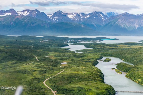 Hugging the shores of Chignik Lake just above its outlet into the Chignik River, the village of Chignik Lake (center) is comprised of a few houses and buildings and a sum total of about three miles of dirt road running from a short dirt airstrip (highlighted light blue, center-right) and terminating at a small boat landing on the river just below the bottom edge of this photo. Note the weir spanning the river, lower right. This guides migrating salmon toward an opening on the right-side bank where Alaska Department of Fish and Game personnel count them. All five species of Pacific Salmon found in North America enter the Chignik: Sockeyes, Pinks, Chum, Coho and Chinook, the numbers for all but Pinks have been depressed in recent years. A few Steelhead – the anadromous form of Rainbow Trout – also enter the Chignik. Dolly Varden char are abundant. (August 14, 2018)