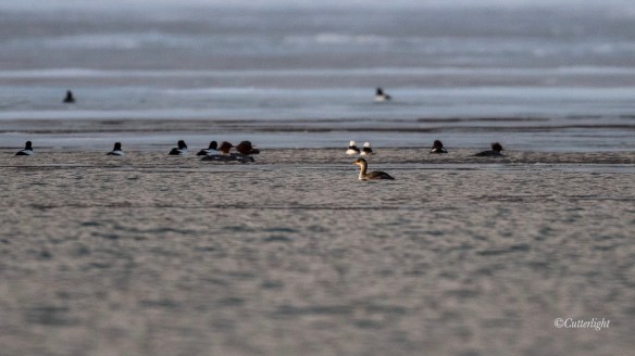 Buffleheads, goldeneyes, mergansers… and center stage an adult Red-necked Grebe in nonbreeding plumage. (Chignik Lake, January 24, 2017)