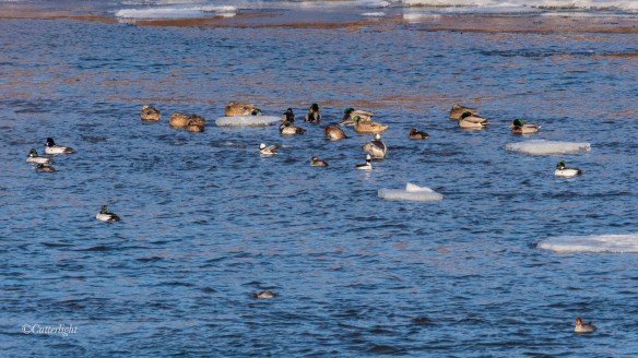 A few over-wintering and early-arriving migrate ducks gather in an icy riffle on The Chignik. Included in this photo are Mallards, mergansers, Buffleheads, Common Goldeneyes, a pair of Ring-neckeds, a Greater Scaup Drake and a Tufted Duck. Just upriver was a group of Tundra Swans. Pintails and Green-winged Teal will soon join the party. (March 14, 2017)
