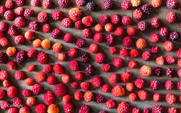 Not as resilient as blueberries, lingonberries, currants and crowberries, members of the Rubus family – raspberries, salmonberries and blackberries – benefit from a bit of TLC, especially when we want nice-looking fruit for finishing the top layer of pies or to be able to add individual berries to our breakfast cereal or to salads. So, for us it’s worth the little bit of extra effort to arrange the berries on a baking sheet lined with parchment paper and to quick freeze them. Once they’re frozen solid, the fruit remains separate and is firm enough to withstand vacuum-packing without clumping. The result is small bags of gourmet-quality individual berries, their flavor actually intensified by the freezing process.