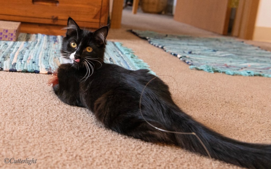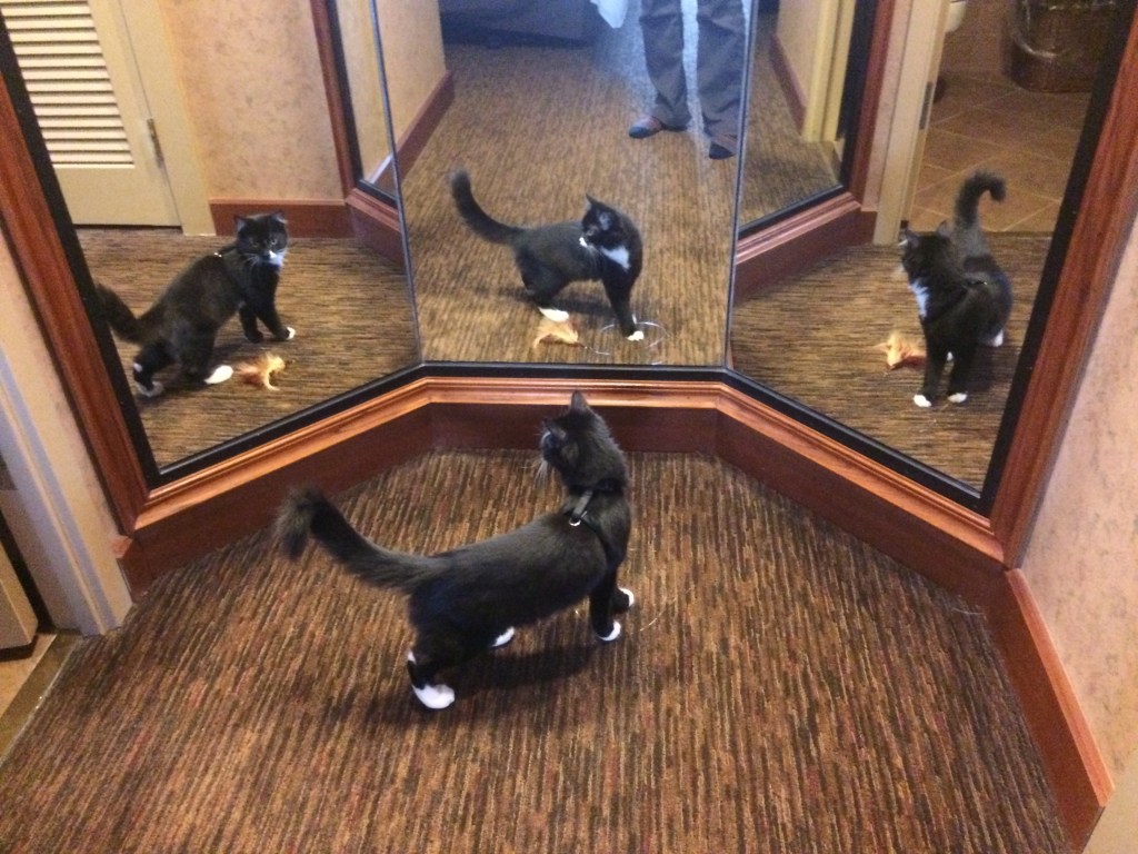 Well, it’s been quite a couple of days! First, I went with my new owner to a hotel. It was a cool and strange scene. The place was almost devoid of smells and was humming with funny sounds. There were these curious glass panels with kittens behind them that looked just like me! By the time I was finished sussing out the place, night had fallen. I climbed up on a gigantic bed, nestled into a hundred pillows and proceeded to fall asleep. Then, all of a sudden, there were terrifying creaking sounds like the building was going to break. Fearing the worst and not knowing what to do, I jumped up and hid under the bed. A few minutes later a ringing sound made Barbra turn on the light and talk into a little machine. I heard her say “8.2 magnitude? Are you ok? I’m relieved to hear that.” She seemed worried for a bit. Finally, she quieted down, I climbed back onto the bed and we both fell asleep. A short time later, a loud alarm went off and scared both of us awake. Turns out it was a false alarm, maybe triggered by the earlier earthquake. At that point, both of us were too amped up to sleep. We turned our attention to playing games with the feather toy Barbra had brought for me.