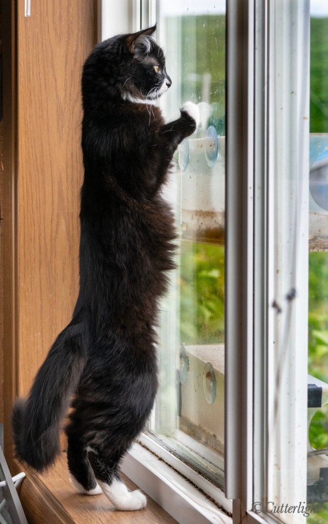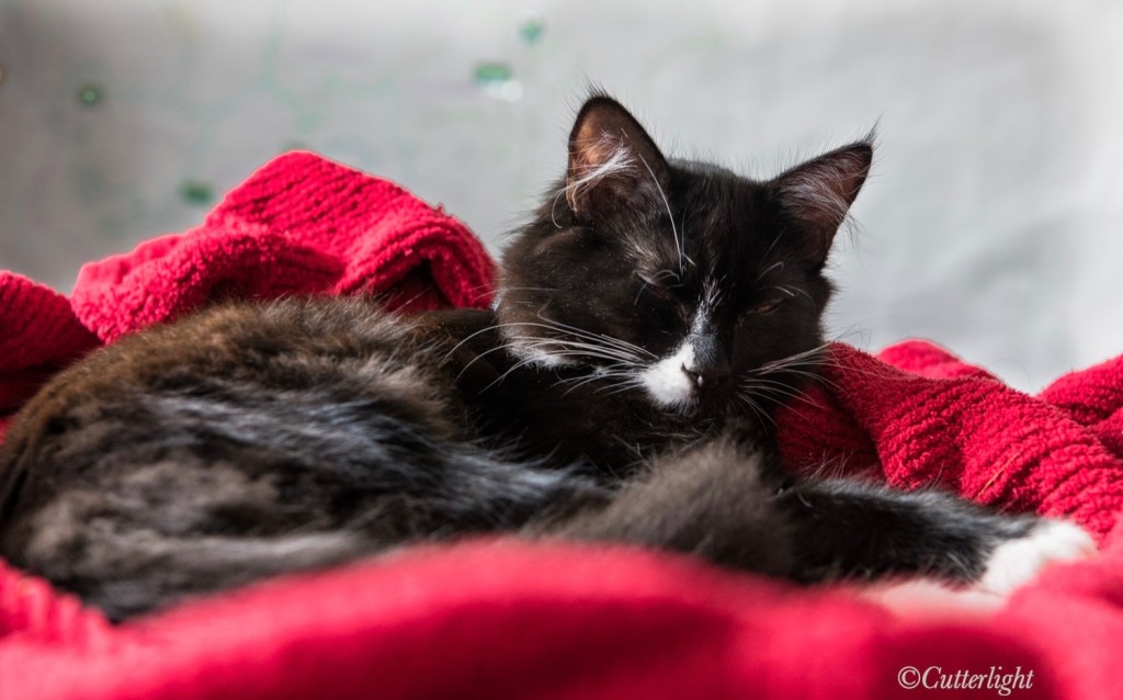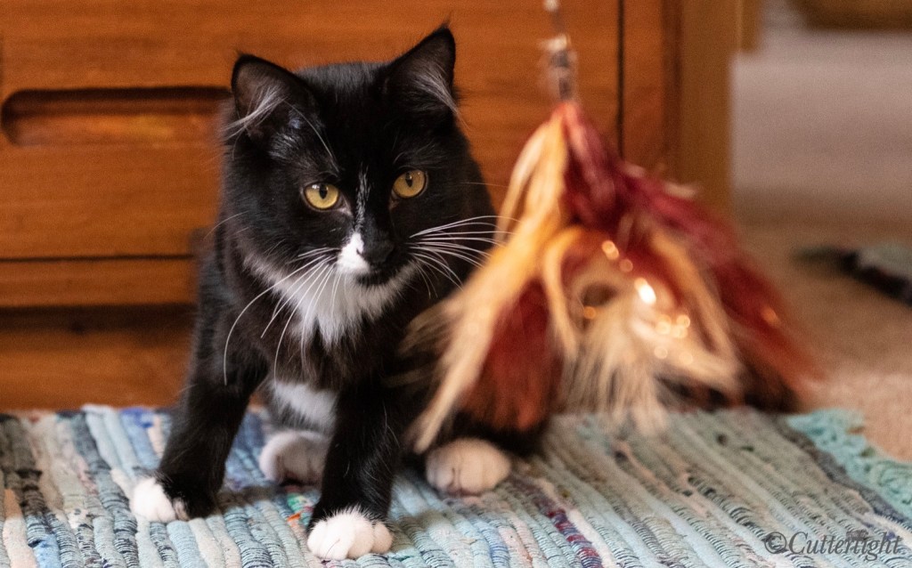 Let me tell you about my new home. It’s big and has very different noises than my foster home. I get all the attention from my two people. They love to play with me. They even made me some new toys. I love to sit on the windowsill and watch the birds at the window feeders. If I get tired, there are soft blankets for me to nap on. At nighttime, I get to share a bed with my new warm family. I think I’m going to have a great life with many fun adventures with these two.