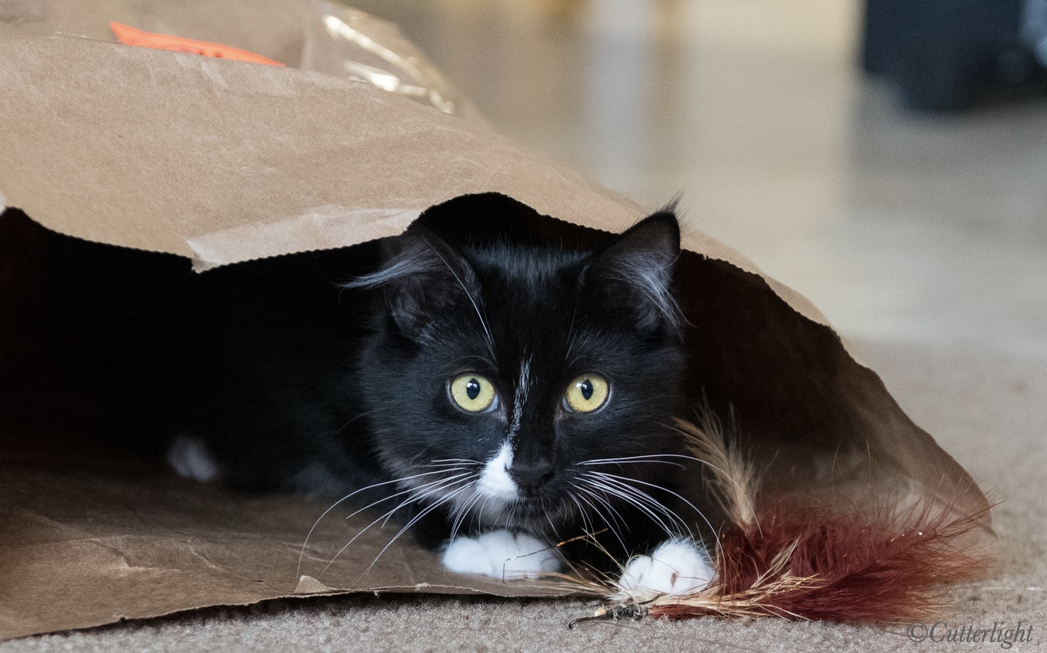 Well, it’s been quite a couple of days! First, I went with my new owner to a hotel. It was a cool and strange scene. The place was almost devoid of smells and was humming with funny sounds. There were these curious glass panels with kittens behind them that looked just like me! By the time I was finished sussing out the place, night had fallen. I climbed up on a gigantic bed, nestled into a hundred pillows and proceeded to fall asleep. Then, all of a sudden, there were terrifying creaking sounds like the building was going to break. Fearing the worst and not knowing what to do, I jumped up and hid under the bed. A few minutes later a ringing sound made Barbra turn on the light and talk into a little machine. I heard her say “8.2 magnitude? Are you ok? I’m relieved to hear that.” She seemed worried for a bit. Finally, she quieted down, I climbed back onto the bed and we both fell asleep. A short time later, a loud alarm went off and scared both of us awake. Turns out it was a false alarm, maybe triggered by the earlier earthquake. At that point, both of us were too amped up to sleep. We turned our attention to playing games with the feather toy Barbra had brought for me.