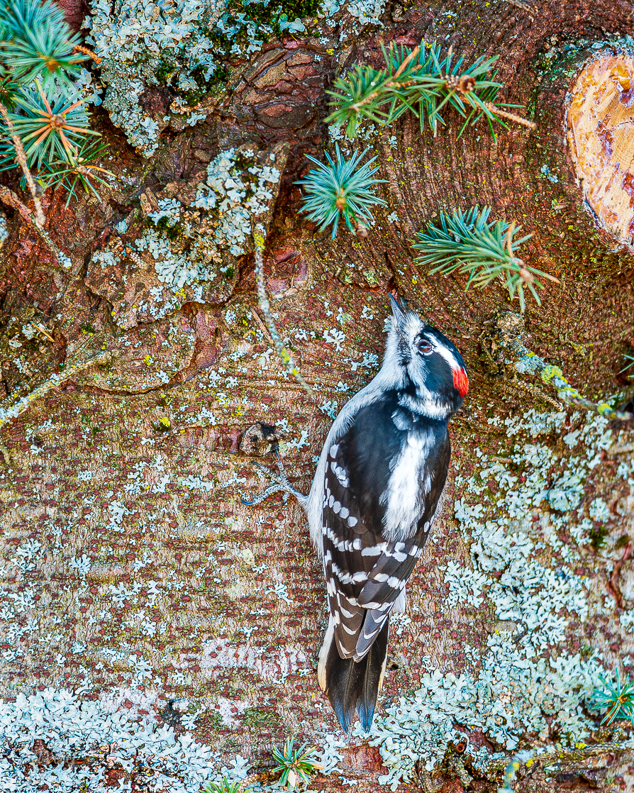 The red crown distinguishes this specimen as a male. Note the blue tint on the tips of his tale, an iridescence not often so easily observed in Downies. Like other woodpeckers, Downies use their stiff tail feathers as a kind of third leg to provide leverage is they drum or search tree trunks for insects.