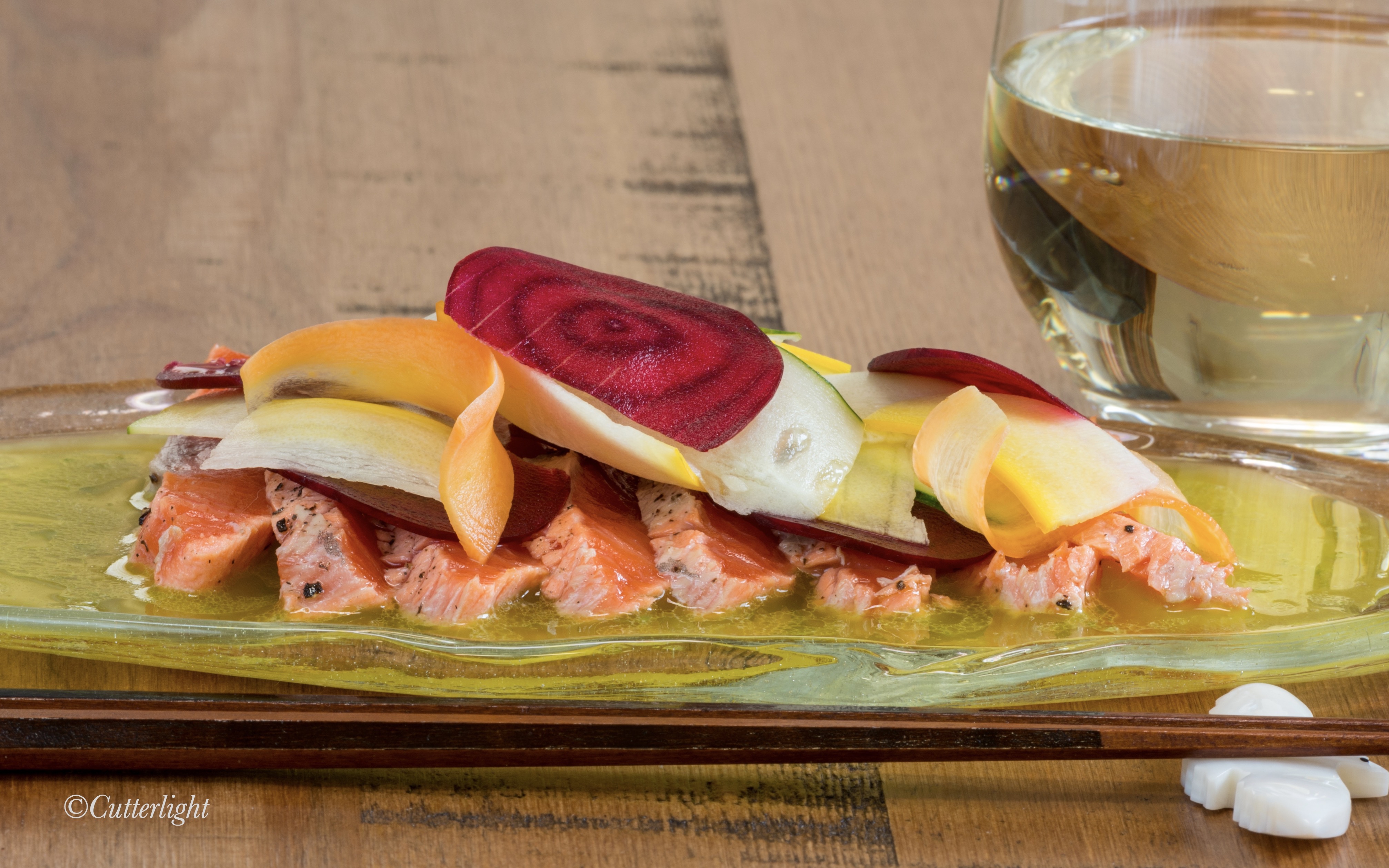 1. Vegetables: Prepare two bowls of ice water. Use a mandolin to slice vegetables lengthwise as thin as possible. Immerse slices in ice water for an hour to make the vegetables crisp. Do the beets separately, using a separate bowl, to keep them from coloring the other vegetables. (You might want to wear nitrile gloves to keep the beets from staining your fingers.)