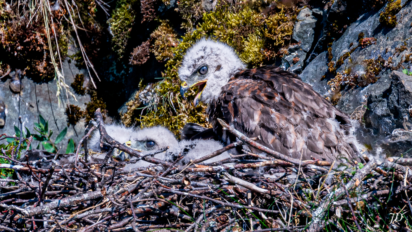 In hindsight, it might have been worthwhile to construct a blind at a respectful distance and to thereby more thoroughly record the nesting events that occurred every summer until recently at this little ledge about 60 feet up from the surface of the river. A regret is that I never made a video of the birds. Unfortunately, in July 2021, a magnitude 8.2 earthquake rocked the Chignik area and in so doing deposited a volleyball-sized boulder squarely in the center of the nest. The little ledge had always been a precarious site – exposed at times to high winds, vulnerable to potential predation by our resident Great Horned Owls, and subject to regular skiff traffic (and associated engine noise) – and in fact the summer of the big quake after laying just one egg, for unknown reasons the hawks abandoned the nest, before the earthquake struck.