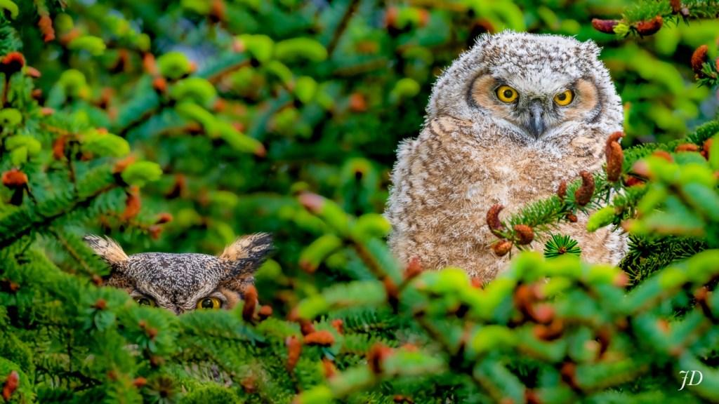 But that didn’t make photographing them much easier. During daylight hours, the owls typically secreted themselves in the very thickest parts of an exceptionally healthy and dense copse of Sitka Spruce trees. Many times, only a hint of the large birds was visible – a patch of breast feathers, a vigilant eye, an alert ear tuft. In addition to the challenges presented by the dense spruce boughs, the copse of trees was situated in a hollow where the light was almost never what a photographer might call “good.” Not only did the owls bury themselves in the boughs of those trees, their favored roosts were fairly high up. And although I am fairly certain that I knew more or less exactly where the nest was, I was never able to put my eyes on it.