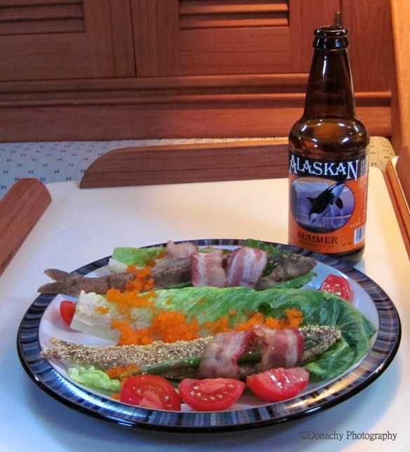 Freshly caught smelt prepared two ways: In the foreground, the fish was rolled in polenta. The smelt in back was dusted in seasoned flour. The fish were pan fried, wrapped in bacon and placed on whole leaves of Romain lettuce to be eaten from head to tail, bones and all. A sprig of asparagus and a few dollops of bright orange flying fish roe (tobiko) finishes the lettuce taco.