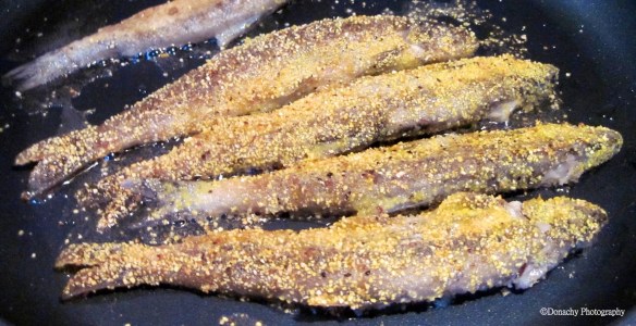 In the foreground: Polenta is especially coarse cornmeal. Seasoned with salt and pepper, rolling smelt in polenta gives these soft-fleshed fish a nice crunch when pan friend. In the back: another way to prepare smelt for the frying pan is by dropping them into a Ziplock bag containing seasoned flour and giving them a few shakes. Tarragon, fennel, marjoram and salt and pepper are a good start when seasoning these fish. Tongs make this a neat job. Note the asparagus in the pan on the stove.