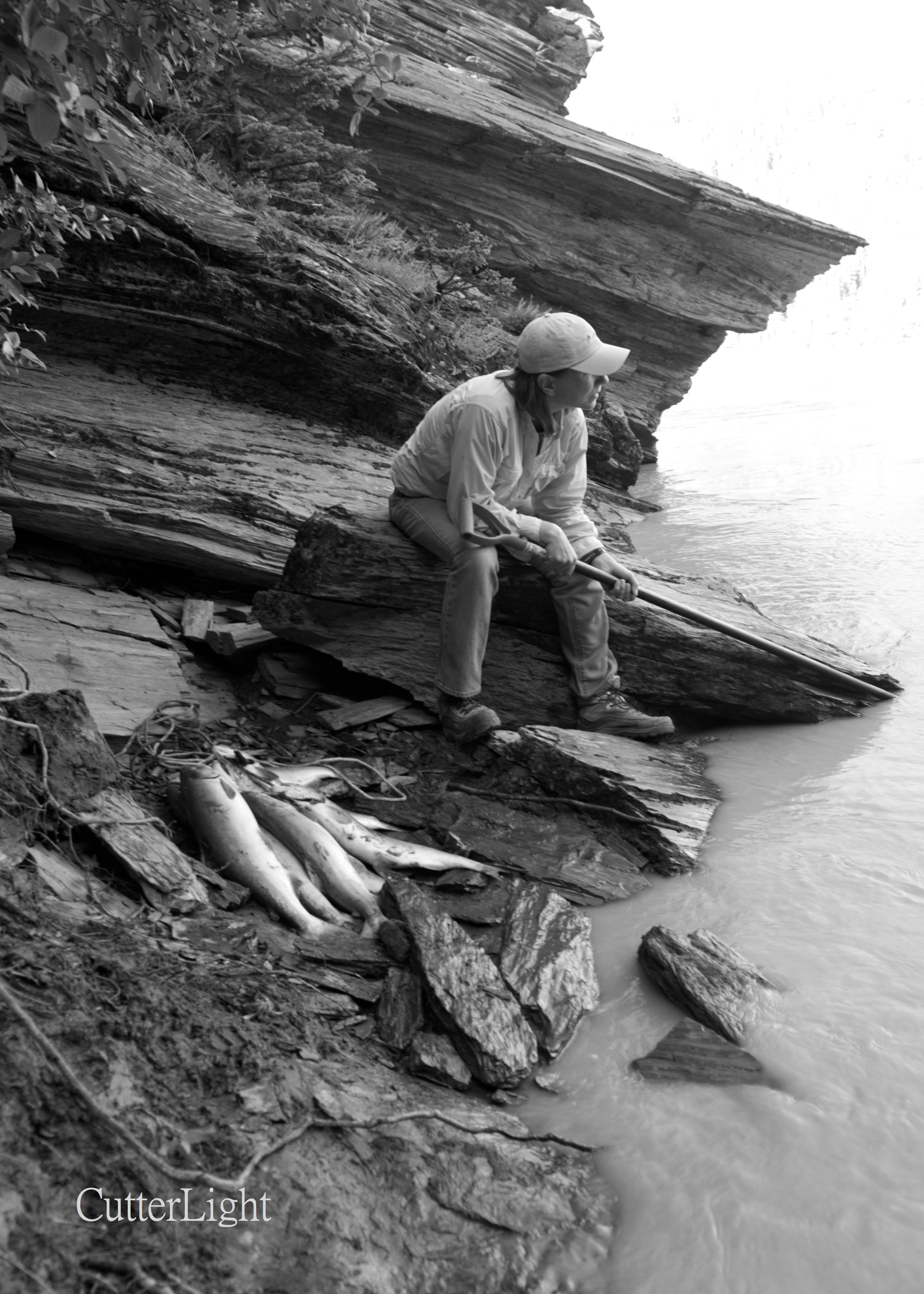This is not the fishing of hackle and thread carefully presented on graceful, arcing casts, nor even of Pixie spoons heaved out and fluttered through clear riffles. The net our friend Nathaniel Wilder has loaned us measures roughly three feet across and four feet long and is attached to a 12-foot handle. The rig is cumbersome, made more so by the surging tug of the current and we take turns bracing the handle against a slate rock outcropping to keep it steady in the river’s flow. When a fish hits, the net comes to life.