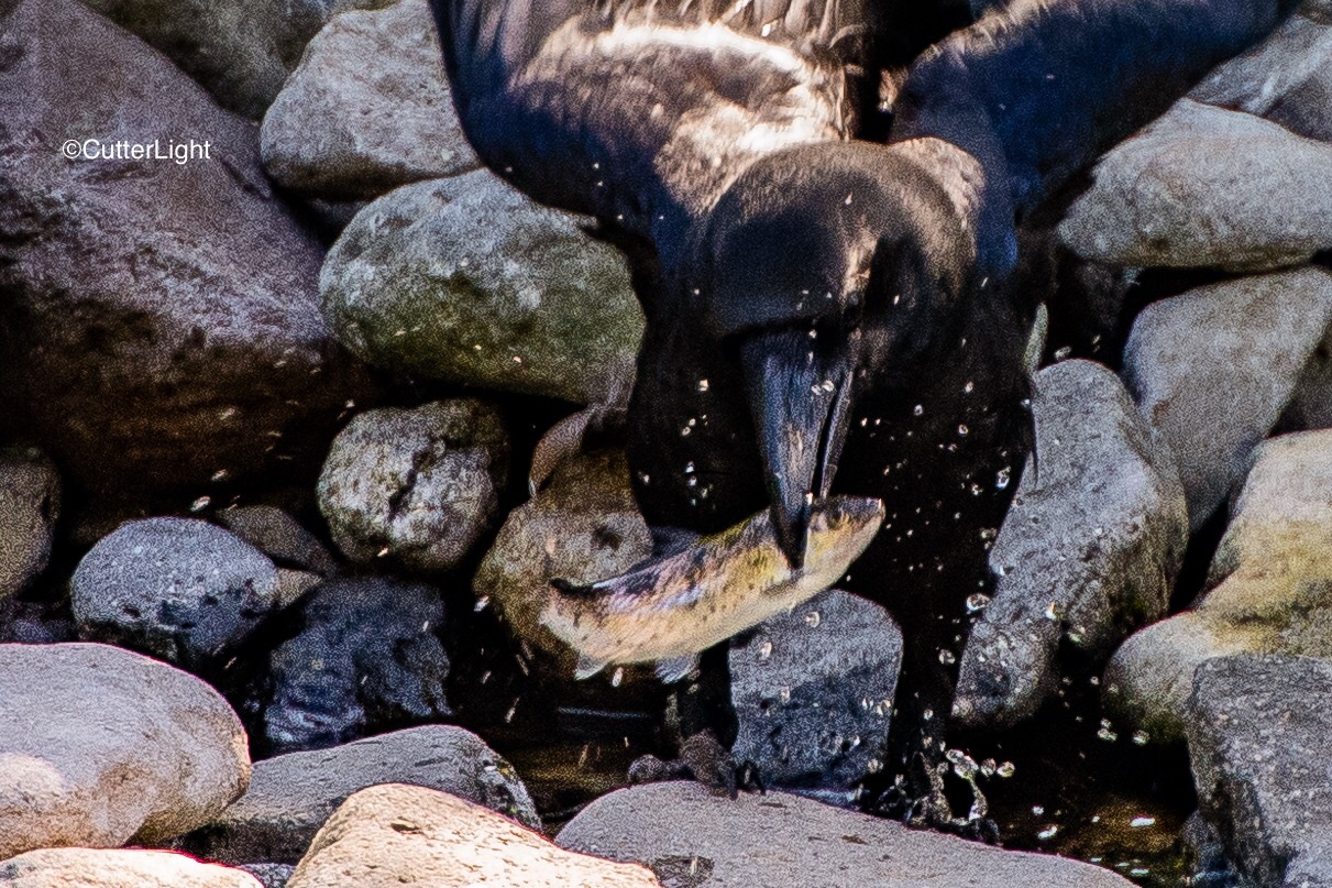 A happy bear eating salmon at one end and light at the other. A perfect tunnel.