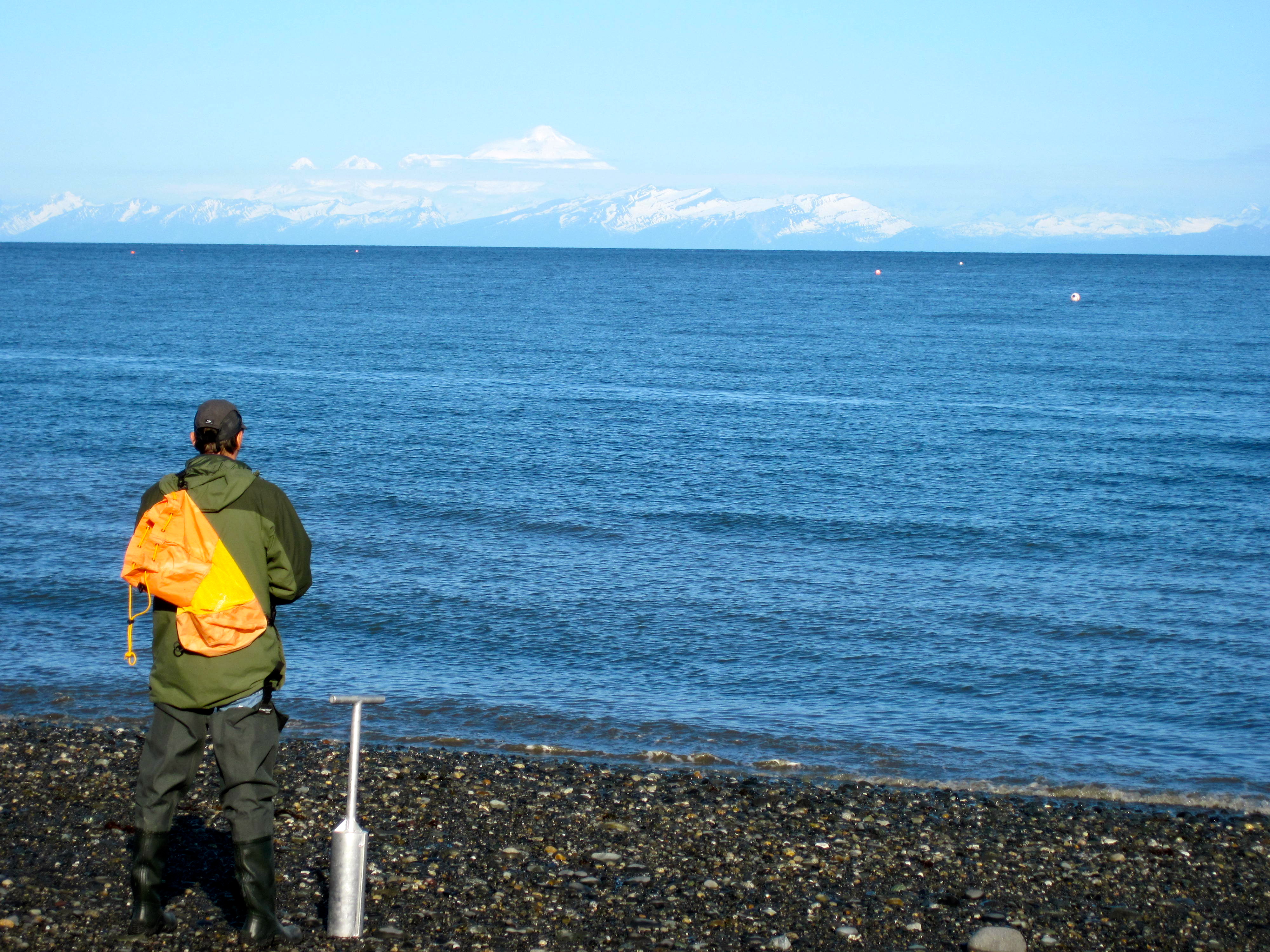 the clam digger walks the pebbled beach and waits