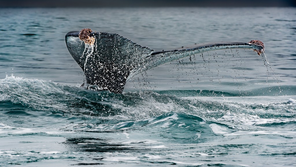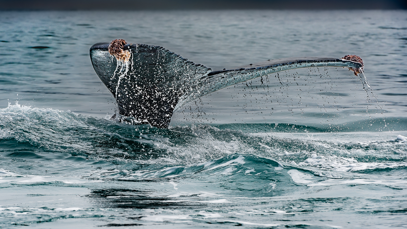 The light was in and out throughout the encounter, the sun at times obscured behind dark clouds, at other times breaking through clear blue skies. Here dappled light is filtered through thin clouds, creating a rainbow-like effect accentuating blues, mauves and purples. This image is interesting for the background landscape as well. The land mass to the left is Nakchamik Island. The smaller island to the right is the smaller of the two Kak Islands. On the right is (I think) Little Castle Cape on the mainland.