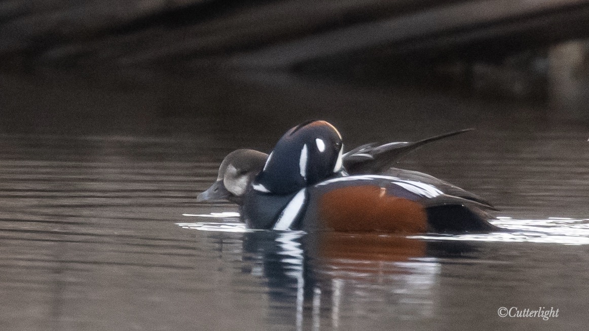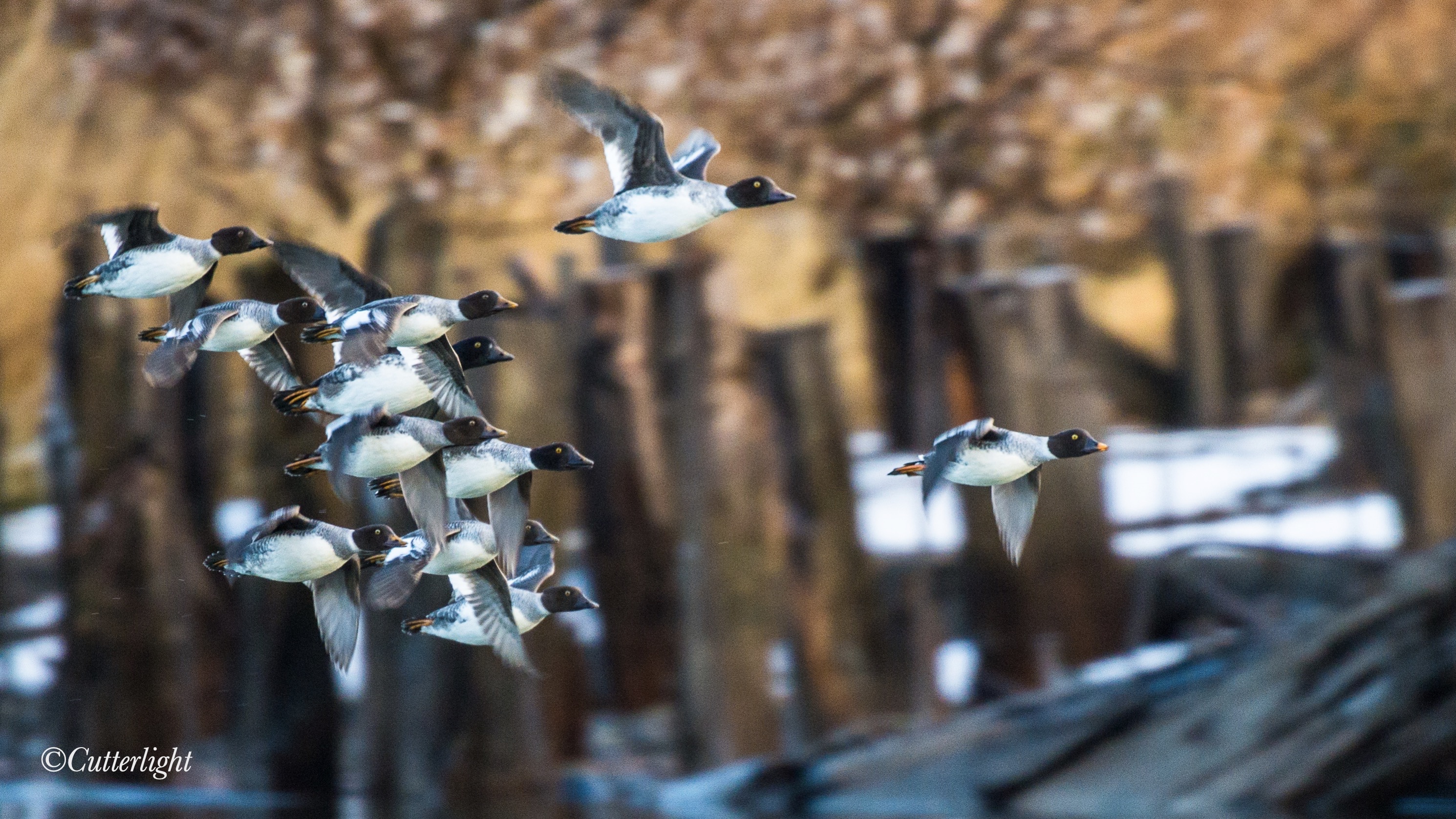 The distinctive whistling sound goldeneyes in flight make has led to their nickname: Whistler. Clangula, their scientific specific name is misleading; they don’t seem to be nearly as vocal as other ducks. When feeding, they are quite active, paddling with purpose and diving in a sudden arch. They often join in with mergansers to cooperatively feed along a shoreline or underwater edge – birds of both species surfacing with wriggling fish.