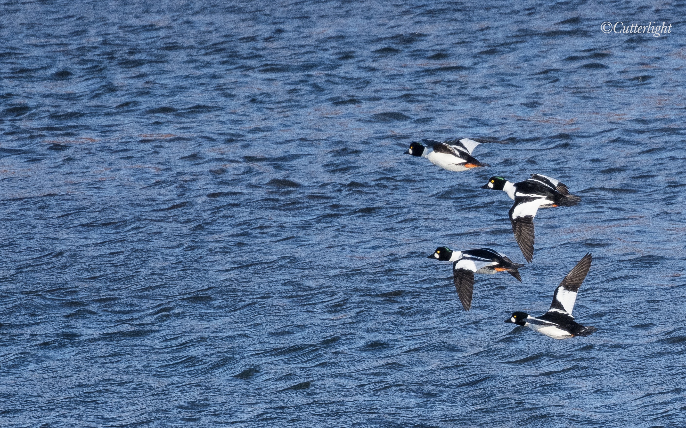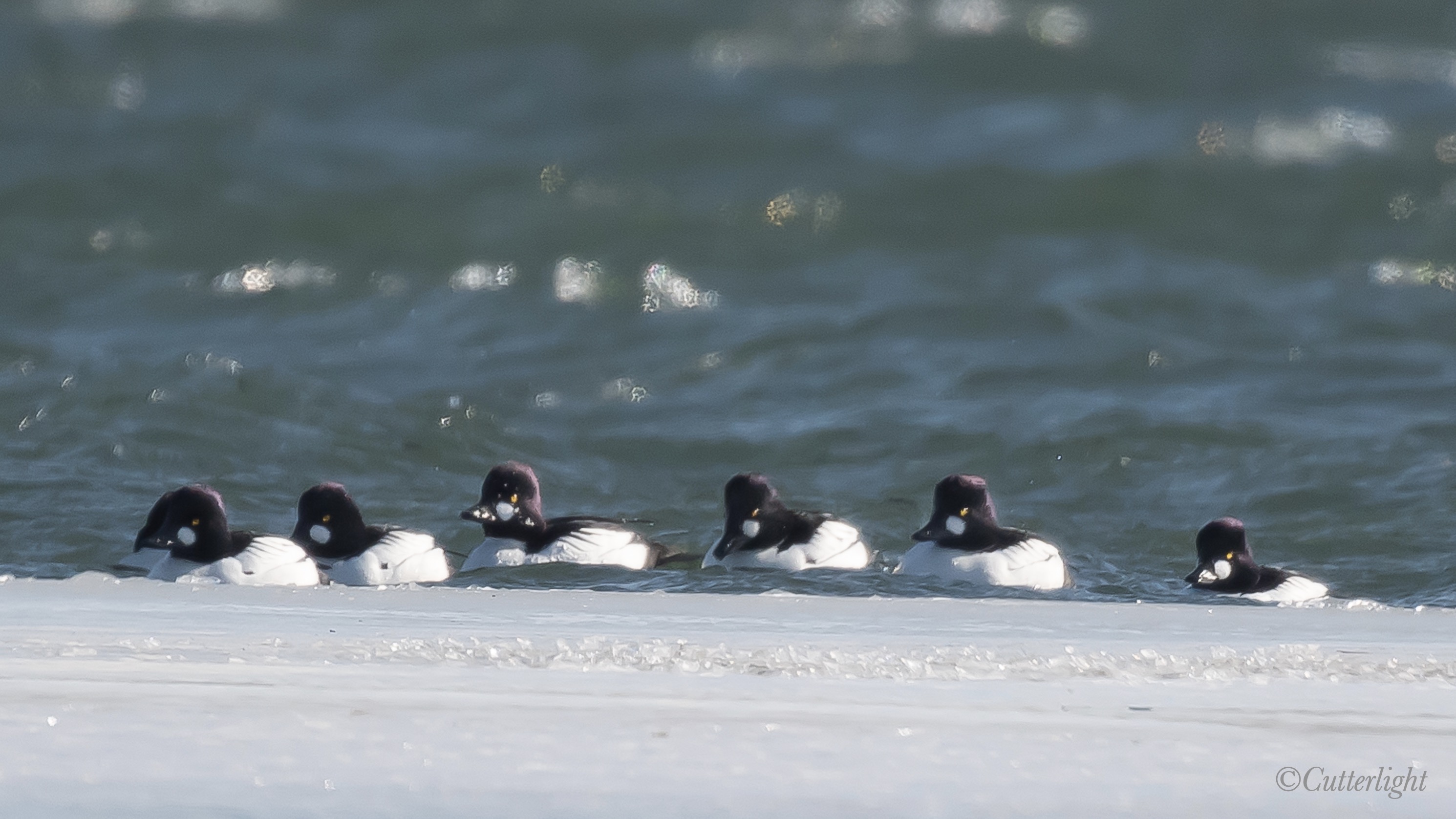 As is the case with other “green-head” drakes, Greater Scaup and Mallards, in certain light the head feathers of Common Goldeneyes can appear purple, as is the case with all seven birds in this photo. (Chignik River, March 12, 2017)