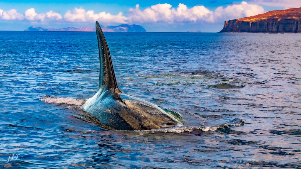 The light was in and out throughout the encounter, the sun at times obscured behind dark clouds, at other times breaking through clear blue skies. Here dappled light is filtered through thin clouds, creating a rainbow-like effect accentuating blues, mauves and purples. This image is interesting for the background landscape as well. The land mass to the left is Nakchamik Island. The smaller island to the right is the smaller of the two Kak Islands. On the right is (I think) Little Castle Cape on the mainland. JD, Chignik Bay, Gulf of Alaska, May 6, 2018