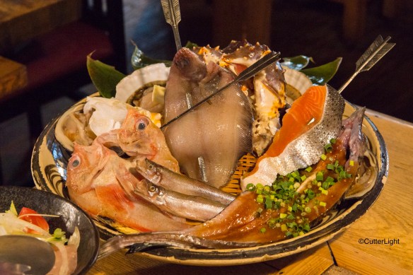 Our waiter’s recommendation: a platter of seafood ready for the tabletop grill featuring some of Shiraoi’s regional summertime specialties. From 12:00: King Crab legs, ocean-fresh salmon, Sailfin Poacher, Willow Leaf Smelt, Thornyhead Rockfish, Surf Clam, Sea Scallop, center, flounder. (Viewer discretion is advised regarding the food photographs that follow.)